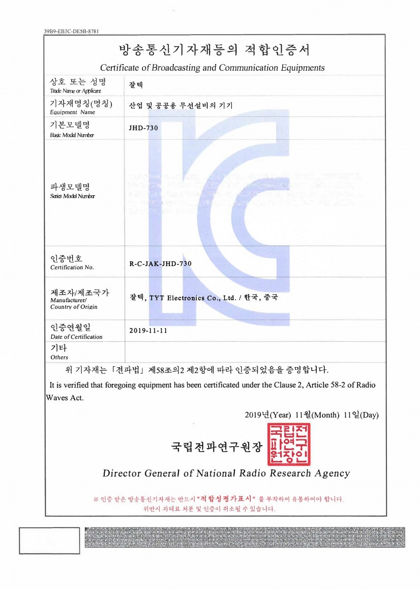 목록 [기타] 제품인증서(JHD-730 Series) 작성자 잘텍 작성일 20-01-24 11:43 | 조회 46,275 | 댓글 0 본문 디지털 무전기 JHD-730 Series 인증서입니다. 이전글다음글 댓글목록 0 등록된 댓글이 없습니다. 목록